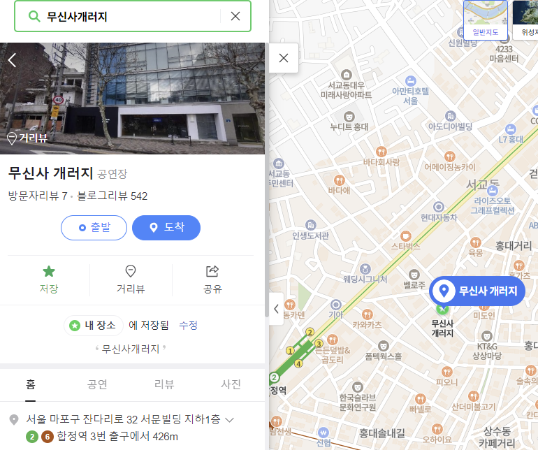 무신사 개러지는  합정역 3번출구에서 도보로 6분 거리에 떨어져 있는 곳에 있어요, 상수역에서는 11분 걸려 그렇기 때문에 대중교통을 이용하기 매우 편리한 공연장이라고 생각해요 하지만 부득이한 사정으로 인해 꼭 자차를 이용해서 방문하시는 분들께는 주차장 정보가 꼭 필요하시기 때문에 정보를 정리해 봤어요