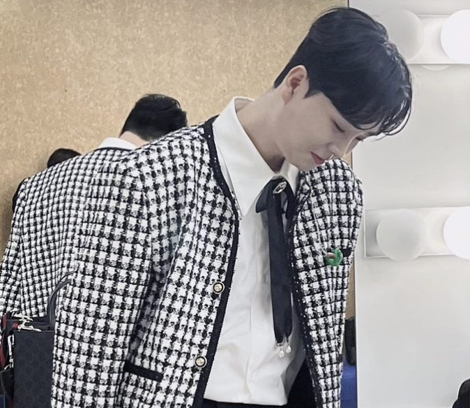 송민준 회색 정장사진, 알파카 인형과 함께 찍은 사진