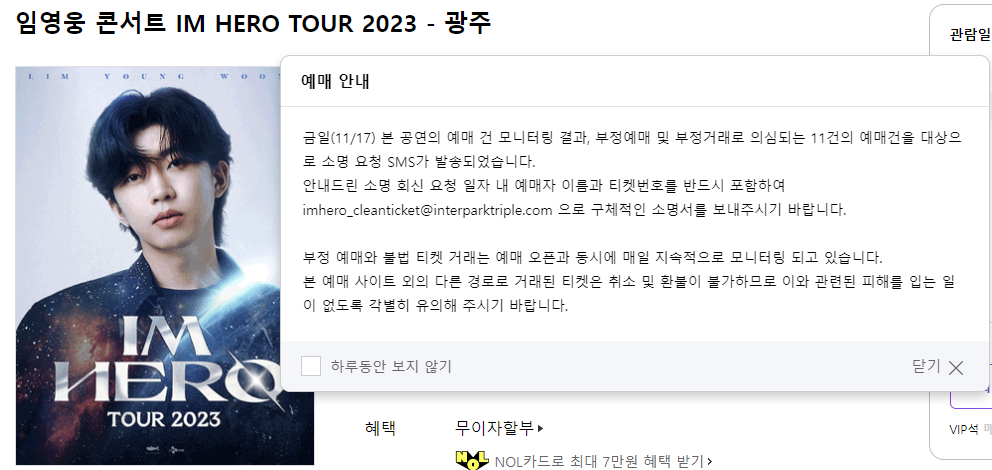 하나는 취소되는 표를 기다렸다가 예매하는 방법입니다. 현재 임영웅 콘서트는 부정 예매 및 부정거래에대한 의심 예매건이 공지된 상태입니다. 11건의 예매건이 소명을 요청되었습니다.