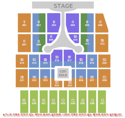 대전에서는 1~20구역이 단차가 없는 평지구역에 의자가 설치되어있고 가~사구역은 단차가 없는 계단식 좌석입니다.