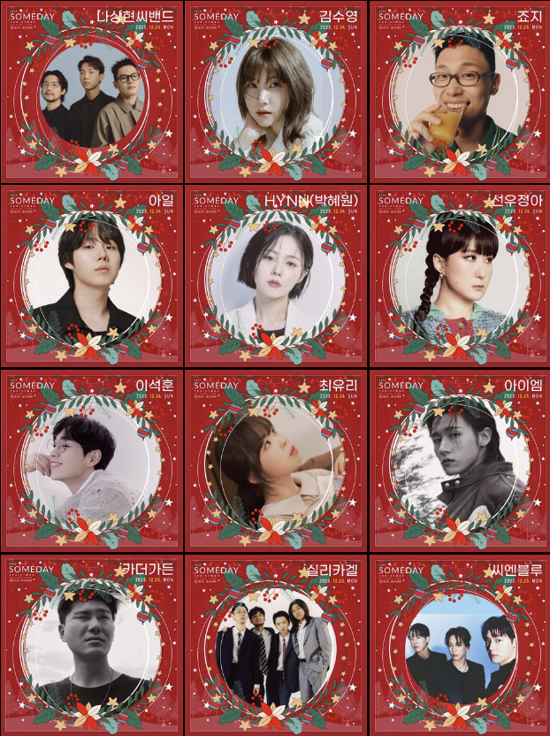 2023 Someday Christmas에는 나상현씨밴드, 김수영, 죠지, 아일, 박혜원, 선우정아, 이석훈, 최유리, 아이엠, 카더가든, 심리카겔, 씨엔블루 등 다양한 가수들이 출연 예정입니다. 일자별로 출연하는 가수들이 다르니 일자에 따라 어느 가수가 나오는지 꼭 확인해 보시기 바랍니다.