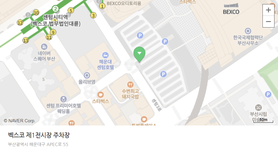 주소는 부산광역시 해운대구 APEC로 55로 검색 하거나 벡스코 제 1전시장 주차장으로 검색하시면 바로 찾아 가실 수 있습니다.